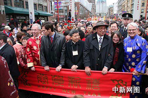 隨著震天的鑼鼓聲、鞭炮聲、大人小孩歡樂的笑聲,“財(cái)神爺”身著大紅袍,頭戴金盔,手舉護(hù)身旗走在游行隊(duì)伍最前面。在南腔北調(diào)的“恭喜發(fā)財(cái)”聲中,新上任不久的卑詩省省督波因特沿途向民眾大派“利是”;加拿大最大反對(duì)黨聯(lián)邦自由黨黨領(lǐng)狄安身穿紅色唐裝,頻頻拱手賀禧;中國駐溫哥華總領(lǐng)事楊強(qiáng),卑詩省省長金寶爾和溫哥華市長蘇利文等加國三級(jí)政要并排而行,拉著寫滿新春祝福的橫幅,與民眾共慶戊子鼠年新春。
