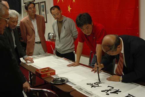 神七發(fā)射成功慶祝會上,美國福州竹歧同鄉(xiāng)會秘書長鄭時(shí)浩即興揮毫。