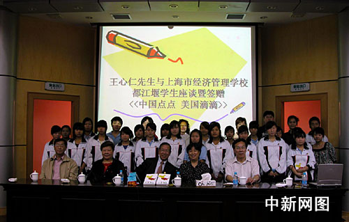 今天的贈書儀式上,王心仁先生與大家分享了他的人生經(jīng)驗。當(dāng)了解到去年汶川大地震后上海市經(jīng)濟管理學(xué)校接收了近70名來自上海對口支援地區(qū)四川都江堰的學(xué)生時,王心仁先生勉勵這些遠離家鄉(xiāng)的同學(xué)能夠珍惜學(xué)習(xí)機會,并向這些學(xué)生每人送上了一張上海交通卡,希望他們多多了解這個城市。
