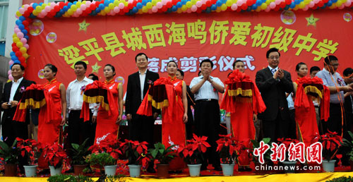 中新網(wǎng)梁平6月21日電 (記者 郭晉嘉)21日,重慶市梁平縣城西海鳴僑愛中學(xué)(原梁平城西中學(xué))竣工落成,國僑辦副主任馬儒沛、僑愛中學(xué)捐資人屠海鳴等出席落成剪彩儀式。