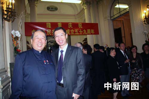 是晚的中國駐法使館內(nèi)張燈結(jié)彩,一派喜氣;走廊里布置的北京國家體育場——鳥巢掩映在璀璨的禮花中,分外奪目;旅法華人社團(tuán)向祖(籍)國祝賀生日的花籃從使館大門口排到了二樓。身著中式禮服的中國駐法大使與僑胞們同賀祖(籍)國59華誕。