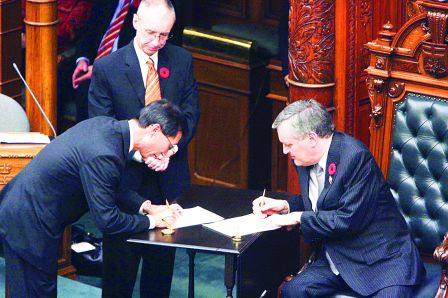 中新網(wǎng)11月1日電 據(jù)加拿大《明報(bào)》報(bào)道,競(jìng)選連任成功的加拿大安省省長(zhǎng)麥堅(jiān)迪10月30日率領(lǐng)新內(nèi)閣宣誓就任。華裔省議員陳國(guó)治再上層樓,被麥堅(jiān)迪委以重任,出任安省公民及移民廳廳長(zhǎng),成為安省內(nèi)閣的一名重要成員。陳國(guó)治在宣誓就任的儀式結(jié)束后向中文媒體表示,感謝省長(zhǎng)給他這個(gè)機(jī)會(huì),可以為安省的新移民、新公民服務(wù)。