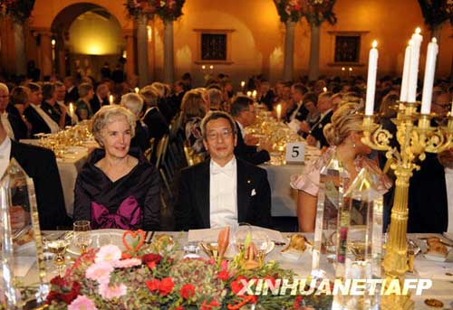美籍華裔科學(xué)家錢永健(中)在瑞典斯德哥爾摩領(lǐng)取諾貝爾化學(xué)獎后參加盛大晚宴。(新華社/法新)