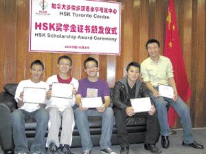 郭凌清、李賦涵、張庭、黃帝鈞、張龍江五位同學(xué),都在去年參加由加拿大多倫多漢語水平考試中心主辦的中國(guó)國(guó)家漢語水平考試,并取得優(yōu)異成績(jī)。4日他們?cè)谟H友和家長(zhǎng)的陪同下,領(lǐng)取國(guó)家漢辦孔子學(xué)院獎(jiǎng)學(xué)金證書,并暢談暑期前往中國(guó)學(xué)習(xí)漢語的美妙經(jīng)歷。