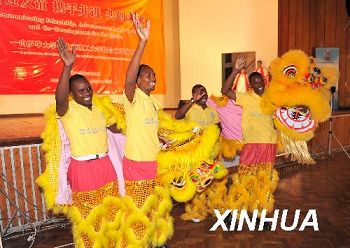 10月12日,在肯尼亞首都內(nèi)羅畢,4名內(nèi)羅畢大學(xué)孔子學(xué)院的學(xué)生在聯(lián)歡會上表演中國舞獅。當(dāng)天,200多名來自北京理工大學(xué)、內(nèi)羅畢大學(xué)孔子學(xué)院和津巴布韋大學(xué)孔子學(xué)院的大學(xué)生們在內(nèi)羅畢大學(xué)舉行聯(lián)歡會,同學(xué)們以合唱、舞蹈等精彩的節(jié)目交流情感傳遞友誼。(新華社/徐速繪 攝)