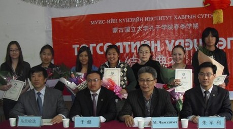 中新網(wǎng)5月26日電 據(jù)國(guó)家漢辦網(wǎng)站消息,5月21日,蒙古國(guó)立大學(xué)孔子學(xué)院隆重舉行了春季學(xué)期結(jié)業(yè)典禮。院長(zhǎng)于健、副院長(zhǎng)其米德策耶、院長(zhǎng)助理朱軍利及專家教師烏蘭哈達(dá)出席了結(jié)業(yè)典禮。