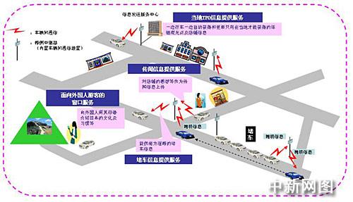 本系統(tǒng)考慮了信息通信基礎(chǔ)設(shè)施不十分完備的旅游觀光地的地域特性,在無線基站沒有聯(lián)網(wǎng)的情況下,也能靈活運用以車輛間通信技術(shù)為基礎(chǔ)的“車輛傳輸信息,以及車輛間直接構(gòu)成網(wǎng)絡(luò)”功能,提供:①當(dāng)?shù)豑PO信息提供服務(wù);②傳聞信息提供服務(wù);③堵車信息提供服務(wù);④面向外國人旅游觀光客的向?qū)Х⻊?wù)等與旅游司機(jī)需求相匹配的信息。