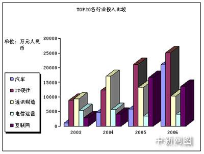 現(xiàn)在的情況是怎么樣呢?整個(gè)中國市場的網(wǎng)絡(luò)廣告投放額在增加,但以前那種一家獨(dú)大的情況不見了。更多的企業(yè)主體參與進(jìn)來了。從下面的網(wǎng)絡(luò)廣告TOP20各行業(yè)投入比較表中可以看到,在2006年,汽車已經(jīng)超越了互聯(lián)網(wǎng)企業(yè),成為對網(wǎng)絡(luò)廣告貢獻(xiàn)比例最大的行業(yè)之一,僅僅次于IT硬件產(chǎn)業(yè)。