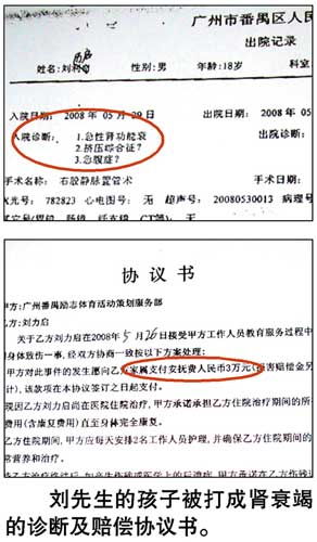 與楊先生同病相憐的還有東莞的劉先生,他的孩子在去年5月26日送進(jìn)一個(gè)訓(xùn)練營(yíng),訓(xùn)練期也是三個(gè)月,繳費(fèi)13100元,而30日孩子便被送進(jìn)醫(yī)院,經(jīng)醫(yī)生診斷為毆打、缺乏飲用水造成的腎衰竭。劉先生說(shuō),訓(xùn)練營(yíng)的訓(xùn)練內(nèi)容“基本上沒(méi)有心理輔導(dǎo),只有少得可憐的法制教育,其余的全部都是‘生理輔導(dǎo)’和軍事訓(xùn)練”。