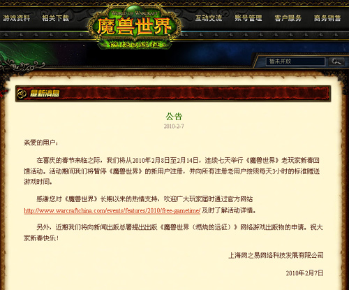 網(wǎng)易昨天是在一篇魔獸世界游戲內(nèi)活動的公告中披露上述消息的。公告稱將從2010年2月8日至2月14日,連續(xù)七天舉行《魔獸世界》老玩家新春回饋活動;顒悠陂g將暫停《魔獸世界》的新用戶注冊,并向所有注冊老用戶按照每天3小時的標(biāo)準(zhǔn)贈送游戲時間。