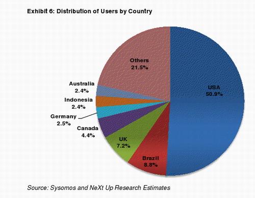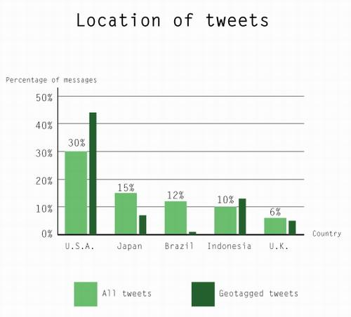 根據(jù)對一周內(nèi)所發(fā)布的1350萬條Tweets的分析顯示,約有三分之一Twitter的用戶來自于美國。而英國作為另一個英語國家所擁有的Twitter用戶數(shù)量則排在第五位,僅有6%的受調(diào)查Tweets來自于法國。用戶數(shù)量排名靠前的幾個國家依次為,美國、日本、巴西、印尼以及英國。