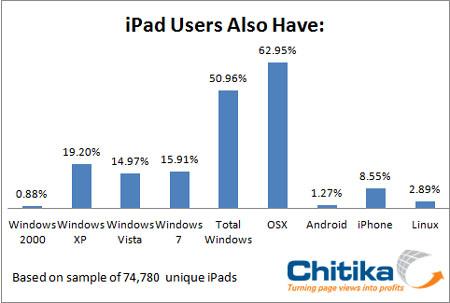 Chitika對(duì)7萬(wàn)多名iPad用戶進(jìn)行了調(diào)查,結(jié)果發(fā)現(xiàn)有50.96%的用戶使用Windows系統(tǒng)。當(dāng)然,使用Mac OS系統(tǒng)的iPad用戶略占上風(fēng),比例為62.95%(部分用戶使用雙系統(tǒng))。