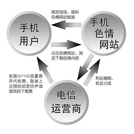 “簡單來說,一條手機(jī)色情信息內(nèi)容的發(fā)布,一般要經(jīng)過三個環(huán)節(jié):運(yùn)營商(主要是指各種手機(jī)圖片、鈴聲、視頻、文字、游戲等內(nèi)容發(fā)布平臺和渠道的提供者)、SP和WAP網(wǎng)站!北本┼]電大學(xué)一個曾長期關(guān)注移動增值業(yè)務(wù)的人透露,“SP在運(yùn)營商和WAP網(wǎng)站間牽線搭橋,三者已形成捆綁各方的利益鏈,一旦獲利,三方都有收益!