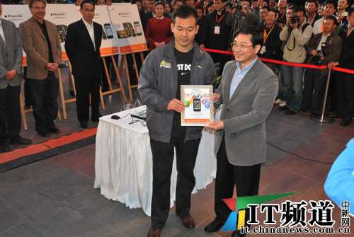 中新網(wǎng)10月30日電 下午6點(diǎn),中國(guó)聯(lián)通iPhone手機(jī)正式在中國(guó)市場(chǎng)發(fā)售。中國(guó)聯(lián)通副總經(jīng)理李剛現(xiàn)場(chǎng)售賣第一臺(tái)iPhone,同時(shí)中國(guó)聯(lián)通高層向現(xiàn)場(chǎng)購得手機(jī)的第一位機(jī)主頒發(fā)證書。