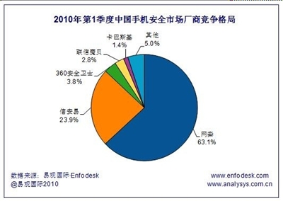 在國(guó)內(nèi)的手機(jī)安全廠商中,網(wǎng)秦以63.1%的市場(chǎng)占有率名列第一,信安易占23.9%名列第二,360安全衛(wèi)士擁有3.8%的市場(chǎng)占有率名列第三。