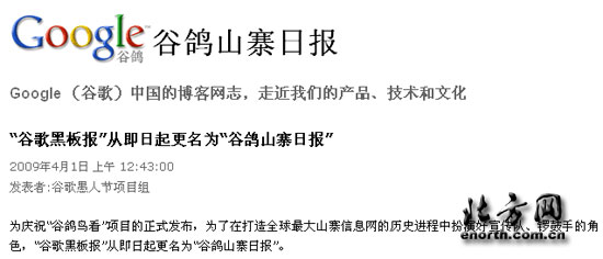 同時,為慶!肮萨濜B看”項目的正式發(fā)布,谷歌中國的官方博客“谷歌黑板報”也在今日“撰文宣布“改名”為“谷鴿山寨日報”。該博客稱:“為了在打造全球最大山寨信息網的歷史進程中扮演好宣傳隊、鑼鼓手的角色,‘谷歌黑板報’從即日起更名為‘谷鴿山寨日報’”。但記者注意到,該日志的發(fā)布者署名為“谷歌愚人節(jié)項目組”,想必“谷鴿鳥看”和“谷鴿山寨日報”的改名行動都是今天這個特殊節(jié)日的一部分。