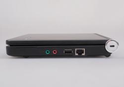 昭陽M10的機身側(cè)面接口比較簡單,但也涵蓋了基本的使用需求。機身前端沒有設(shè)置任何功能接口,不過內(nèi)置了一組雙聲道立體聲音響,在閑暇時放上一段舒心的音樂也是不錯的選擇。機身右側(cè)設(shè)置了一對音頻I/O接口、一枚USB2.0接口、一枚RJ45網(wǎng)絡(luò)接口以及轉(zhuǎn)軸上的安全鎖孔,左側(cè)除電源插孔外還加入了VGA視頻接口、SD讀卡器以及USB2.0接口,足以滿足外接存儲設(shè)備或顯示設(shè)備的需要。