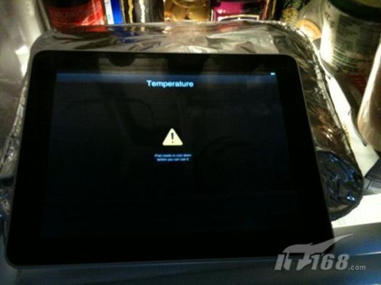 引自:“PC Magazine編輯Zach Honig在twtter” 他帶著他全新的iPad在紐約市出外曬太陽(yáng)(前幾天紐約市的氣溫都超過(guò)攝氏20度左右),十分鐘后iPad就出現(xiàn)了“iPad需要降溫后才能使用”的信號(hào)然后關(guān)機(jī)。Honig把他的iPad放進(jìn)冰箱中,然后幾分鐘后iPad就回復(fù)正常了。