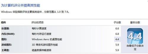 基礎(chǔ)性能測試,我們來看一下預(yù)裝的32位版windows7 Home Basic操作系統(tǒng)給出的分?jǐn)?shù)。體驗索引結(jié)果為,處理器6.6分,內(nèi)存6.8分,圖形和游戲圖形兩項分別為4.4分和5.9分,硬盤為5.9分,得分超過主流中端商務(wù)筆記本。