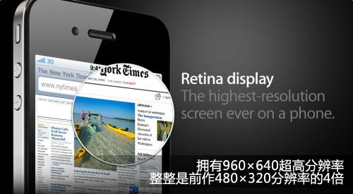毫無(wú)疑問(wèn),iPhone4硬件層面的最大亮點(diǎn)之一,則是其號(hào)稱“Retina Display”的顯示屏幕,其官方稱,該屏幕擁有960×640超高分辨率,是480×320分辨率的4倍,也就是說(shuō),iPhone4一屏可顯示的內(nèi)容量是iPhone3的四倍。即使是目前一些高端Android平臺(tái)的手機(jī),最高分辨率也只有854×480,與其仍有不小的差距。