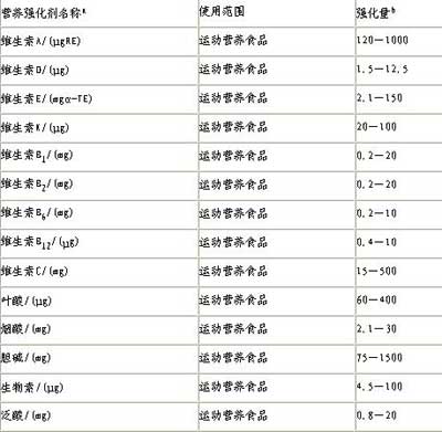 a:營養(yǎng)強化劑的來源使用《食品營養(yǎng)強化劑使用衛(wèi)生標準》(GB14880-1994)批準的營養(yǎng)素來源。 b:強化量以運動員的每天營養(yǎng)素攝入量計。