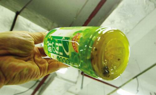 在路邊便利店買了一瓶“康師傅”葡萄汁飲料,仰脖喝下大半瓶后,突然感覺有異物,對著燈光細(xì)看,竟發(fā)現(xiàn)飲料瓶里沉淀有許多黃色的絮狀物品,還有一坨黑乎乎的沉淀物,這是10月16日晚陳先生在福州道山西路一便利店遭遇的一幕。