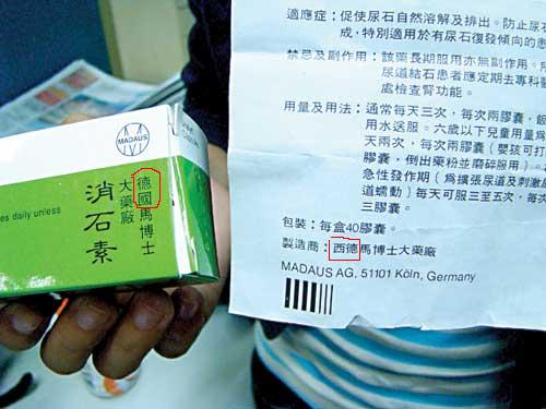 17日上午,記者看到“消石素”的藥盒上寫有“德國馬博士大藥廠”字樣,而說明書上標的制造商,卻是“西德馬博士大藥廠”。就是“德國”與“西德”這點差別,讓李先生對藥品的真實性產生了懷疑。李先生認為,東德與西德早就統(tǒng)一,哪里既有德國,又有西德呢?