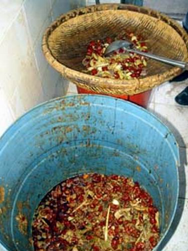 昨日下午,記者以顧客的身份來到該火鍋店,無意中在洗刷間看到,里面排放著2只一大一小臟兮兮的潲水桶。記者走近一看,發(fā)現(xiàn)大桶里有很多剩菜,包括暗紅的辣椒、蔬菜、鴨血、餐巾紙、煙頭、筷子等各種雜物。旁邊的一個(gè)小桶上擱著一個(gè)竹筐和一把勺,筐中已經(jīng)盛了許多辣椒和大蒜等剩菜。記者詢問一名進(jìn)來端盤子的服務(wù)員,撈起這些剩菜做什么用途時(shí),對(duì)方稱老板規(guī)定,客人吃剩的菜不能隨便倒,還可以用。但該服務(wù)員很快就意識(shí)到說漏了嘴,立即問記者進(jìn)洗刷間做什么。記者再問,對(duì)方三緘其口。