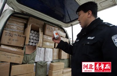 “他們稱自己是快郵公司的,幫一位貨主往石家莊郵局送貨!泵窬顕暾f,他們檢查發(fā)現(xiàn),該車拉的是寄往全國各地治療風濕、關節(jié)炎、定喘等癥狀的保健藥品。通過直觀判斷,這些藥瓶質(zhì)地粗糙,疑似假藥,兩民警立即將情況上報大隊長張紅慶。