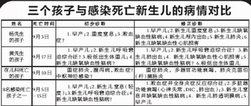 家屬們認(rèn)為,兩位孩子死亡癥狀與公布的8名死亡患兒驚人地相似(見左表),醫(yī)院感染問題應(yīng)該不只是這11天,以這么具體的時(shí)間劃分孩子的死因,顯然違背科學(xué)精神。