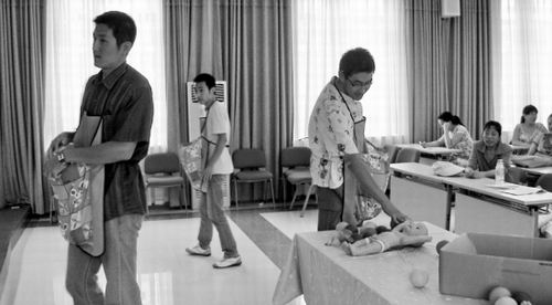 掀開他們的寬大上衣,發(fā)現(xiàn)每一個人都在肚子上綁上了一個沙袋,里面裝著5公斤重的沙子,體驗著孕婦們在孕產(chǎn)期中所需要掌握和學(xué)習(xí)的所有知識,以及因為懷孕而帶來的種種生活不便。