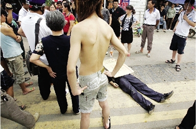 下午1時(shí)30分,記者趕到事發(fā)的樹木嶺路和香樟路交會(huì)處,一男子趴在地上,他滿頭汗水,嘴唇發(fā)青,一只鞋子脫落一旁,一動(dòng)不動(dòng)。他就是王建才。丈夫突然離去,妻子賀建英怎么也不能接受,在一旁呼天搶地,不知所措。