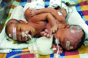 胸腹相連,兩個(gè)小生命緊緊地連在一起。只是他們并不知道,父母和醫(yī)生正為他們的命運(yùn)擔(dān)憂(yōu)。