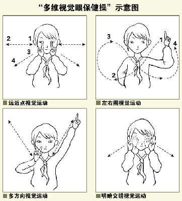 據(jù)介紹,“多維視覺眼保健操”時(shí)長(zhǎng)5分鐘,分“遠(yuǎn)近點(diǎn)視覺運(yùn)動(dòng)”、“左右圓線視覺運(yùn)動(dòng)”、“多方向視覺運(yùn)動(dòng)”、“明暗交替視覺運(yùn)動(dòng)”4節(jié)。做操時(shí),或雙手食指豎起,向前后上下左右方向伸出,或單手在眼前畫8字;眼睛始終盯著手指,隨著手指運(yùn)動(dòng)調(diào)整目光。
