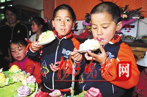 踩過“步步糕”和“子孫蛋”后,儀式最重要的部分開始了。當(dāng)年的主刀醫(yī)生、南京市兒童醫(yī)院新生兒外科徐小群主任醫(yī)師和護(hù)士長夏娟各剪斷了一條尾巴,并送上了禮物——兩個(gè)書包。一下子見到那么多生人,兩個(gè)孩子似乎有點(diǎn)不太適應(yīng),連平日里一向活潑的蘇寧也變得沉默寡言起來。只有在吹完蠟燭吃蛋糕時(shí),兩個(gè)孩子才放松下來,丟下手中的叉子直接啃起了蛋糕。