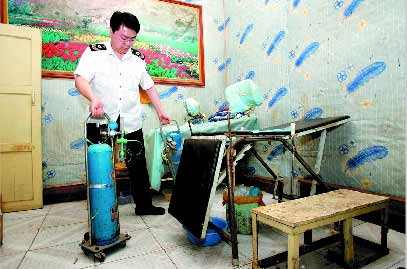 經(jīng)查,該門診部?jī)?nèi)仍存放有大量藥品,一個(gè)小房間內(nèi)放著兩臺(tái)婦科檢查床,還有氧氣瓶和吸宮器等物,沒有任何消毒措施,緊鄰的則是一個(gè)簡(jiǎn)陋病房,里面有4張病床。就是這個(gè)臟亂的黑診所,門牌居然醒目地標(biāo)著“婦產(chǎn)”、“人流”、“引產(chǎn)”等字樣。