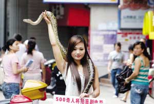 這名自稱叫“優(yōu)優(yōu)”的年輕女子說,她今年22歲,陜西人,曾是專業(yè)舞蹈演員。她從小不怕蛇,3年前自己養(yǎng)起了蛇,剛開始由于缺乏專業(yè)養(yǎng)殖知識(shí),死了好幾條蛇,她為此十分難過,F(xiàn)在她對(duì)“蛇性”相當(dāng)了解,還學(xué)起了蛇舞、印度舞、肚皮舞。優(yōu)優(yōu)指指脖子上的蛇稱,這是條緬甸蟒,10多斤重,進(jìn)食胃口很大,不僅要吃豬肉,而且一次能吃七八只和鴿子差不多大小的鳥。由于養(yǎng)蛇,這幾年來優(yōu)優(yōu)一直單獨(dú)一人居住,“沒幾個(gè)人不怕蛇的,我只能帶著蛇單獨(dú)過。”帶蛇來“逛”山西路,優(yōu)優(yōu)另有目的,她背后的胡導(dǎo)稱,他計(jì)劃花5年時(shí)間搜集500個(gè)奇人,拍攝奇人喜劇電影,讓他們展示各自絕技,目前有人愿出數(shù)百萬拍攝。