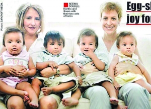 直到2006年,瑪莎才終于利用捐獻(xiàn)精子孕育出了4枚胚胎。這一次瑪莎決定,將4枚胚胎分別植入自己和凱倫的子宮內(nèi),從而增加懷孕的幾率。隨后,瑪莎和凱倫的子宮內(nèi)各自植入了2枚胚胎,令人沒有想到的是,這一次她們竟然雙雙成功懷上身孕!