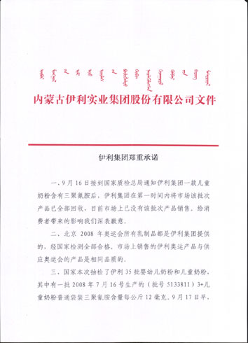 一、16日接到國家質(zhì)檢總局通知伊利集團(tuán)一款兒童奶粉含有三聚氰胺后,伊利集團(tuán)在第一時間內(nèi)將市場該批次產(chǎn)品已全部回收,目前市場上已沒有該批次產(chǎn)品銷售。給消費(fèi)者帶來的影響我們深表歉意。