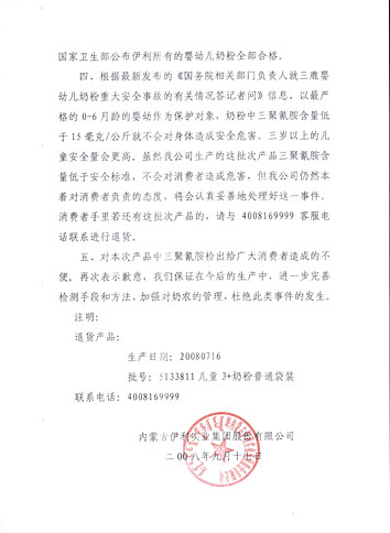 四、根據(jù)最新發(fā)布的《國務(wù)院相關(guān)部門負(fù)責(zé)人就三鹿嬰幼兒奶粉重大安全事故的有關(guān)情況答記者問》信息,以最嚴(yán)格的0-6月齡的嬰幼作為保護(hù)對象,奶粉中三聚氰胺含量低于15毫克/公斤就不會對身體造成安全危害。三歲以上的兒童安全量會更高。雖然我公司生產(chǎn)的這批次產(chǎn)品三聚氰胺含量低于安全標(biāo)準(zhǔn),不會對消費(fèi)者造成危害,但我公司仍然本著對消費(fèi)者負(fù)責(zé)的態(tài)度,將會認(rèn)真妥善地處理好這一事件。消費(fèi)者手里若還有這批次產(chǎn)品的,請與4008169999客服電話聯(lián)系進(jìn)行退貨。
