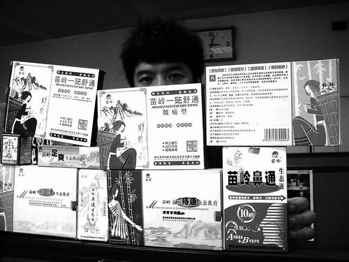 “我有鼻炎,常常鼻塞,有沒有什么好藥?”記者問!氨侨俊睜I業(yè)員從柜臺里面又取出一盒藥說,“你用苗嶺鼻通生態(tài)液吧,也是全中藥,效果特別好!