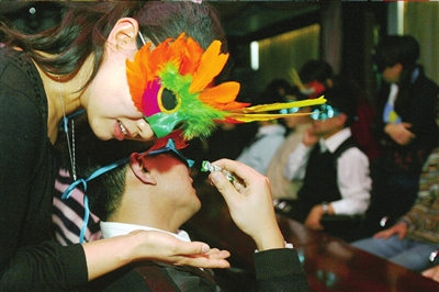 參加者都用眼罩蒙住眼睛,再戴上面具。然后,屋里關(guān)燈,每個(gè)人仔細(xì)甄別異性散發(fā)出來的氣味。如果女士找到屬于自己味道的男士,就可以輕拍他三下,邀請其參加接下來的活動。雙方蒙眼參加“心有靈犀”、“危情應(yīng)對”等一系列的活動之后,選定情侶并將定情鎖送給對方作為信物。