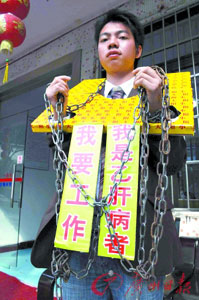 “我是乙肝病者,我要工作”,2月13日上午,廣州南方人才市場附近,來自江西的大學生羅思文眉頭緊皺地戴著自制的紙“枷鎖”,透過掛在胸前的標語,發(fā)出那痛徹心扉的無聲吶喊。此前,羅思文費盡千辛萬苦通過了一家用人單位的考核,卻因為“大三陽”而被拒之門外。