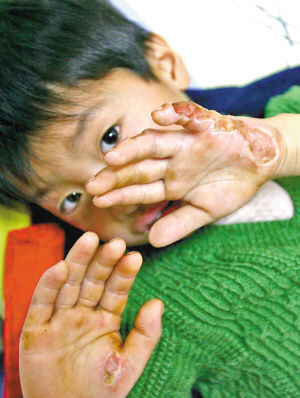 昨日,記者在重慶市兒童醫(yī)院外科病房里看到了這個男孩,在媽媽陪同下他正在輸液。男孩叫何昊陽,躺在病床上會說會笑,只是雙手手背有烏紅的印記和水泡,右手無名指和小指皮膚裂開。叫他動一動,何昊陽雙手手指也能聽話地一伸一捏。
