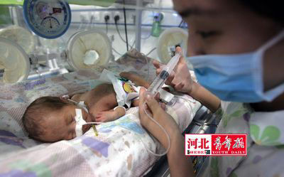 昨日,記者在醫(yī)院的新生兒監(jiān)護(hù)病房看到,三個小男孩兒都躺在保溫箱里。據(jù)兒科醫(yī)生介紹,三個孩子都是低體重早產(chǎn)兒,出生時孕周為33周多。老大是1.58公斤,老二和老三是1.55公斤,自3月16日出生到現(xiàn)在已經(jīng)度過了呼吸關(guān),還有感染關(guān)、喂養(yǎng)關(guān)、黃疸關(guān)在等待著他們。這兩天護(hù)士已經(jīng)開始通過鼻飼管注射給他們喂奶了,三個孩子每次分別給注射7毫升、3毫升和4毫升,2個小時喂一次。從目前來看,除老大有點(diǎn)貧血外,三個孩子心肺功能腦部發(fā)育都很好,預(yù)計還有2到3周孩子們才能出保溫箱。