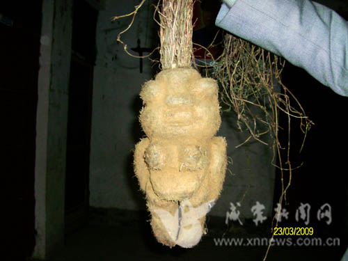 3月21日,在通城縣北港鎮(zhèn)莊前村的杭瑞高速建設工地,施工時挖出一個特大的何首烏。何首烏長相似一女性,雙眼突出,鼻口明顯,雙耳高聳,雙手雙腳如立正姿式,胸圍約40公分,身高35公分,重3600克。