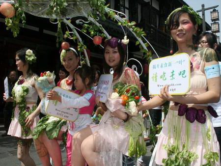 當天正值第四十個世界地球日,成都文殊坊街上人流熙攘。這幫身披菜葉的年輕漂亮女子馬上就成為行人注目的焦點,“喲,遠看就只掛了些菜葉子在身上,原來還是穿了點紗的嘛,是不是又在搞什么商業(yè)活動哦?”四川新聞網(wǎng)記者在現(xiàn)場看到,雖然沒怎么搞清楚狀況,但不少市民已經(jīng)掏出手機來開始拍照。得知是群素食主義者的宣傳活動后不少市民都打趣稱,“用穿得少的美女上街當噱頭,肯定要轟動!