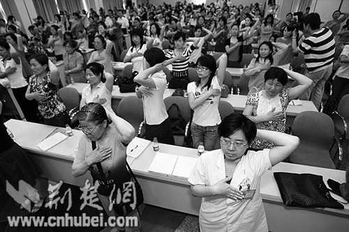 “乳房疾病很煩惱,自我檢查很重要,先舉手,后叉腰,對著鏡子仔細瞧……”昨天,一群女性在同濟醫(yī)院醫(yī)生帶領下,吟誦《乳房自查口訣》,做瑜伽操。