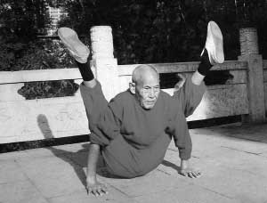雙手撐起90多斤的身體,再將雙腳扛在肩頭,叼起硬幣。家住湖北武昌的88歲肖清連爹爹昨表演了他自創(chuàng)的絕活——蛤蟆功。