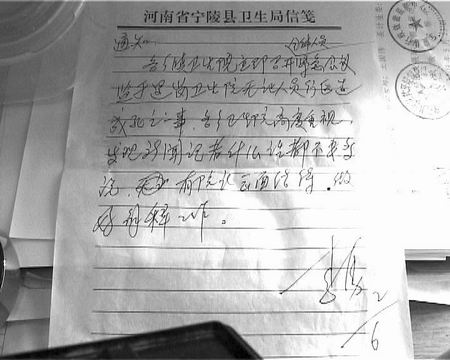 “寧陵縣邏崗鎮(zhèn)衛(wèi)生院沒有行醫(yī)資格的醫(yī)生給我兒媳接生,導(dǎo)致胎死腹中!6月1日,商丘市民權(quán)縣伯黨鄉(xiāng)村民郭漢章打來熱線反映。而記者在采訪中,卻意外地發(fā)現(xiàn)一份該縣衛(wèi)生局長簽名的通知,要求:“各鄉(xiāng)衛(wèi)生院高度重視,發(fā)現(xiàn)新聞記者,什么話都不要多說……”(如左圖)據(jù)郭漢章介紹,5月1日傍晚,兒媳趙婭君感到腹部陣痛,家人立即將其送入寧陵縣邏崗鎮(zhèn)衛(wèi)生院檢查。“當晚做B超檢查時,醫(yī)生說胎音、羊水一切正常。第二天早上6點,醫(yī)生王美英叫來一個人,一起將兒媳送進產(chǎn)房后,兩個人不停地在兒媳腹部擠壓,一個半小時后,趙婭君全身顫抖,面色異常。做了檢查后,證實其腹中胎兒已經(jīng)死亡。”